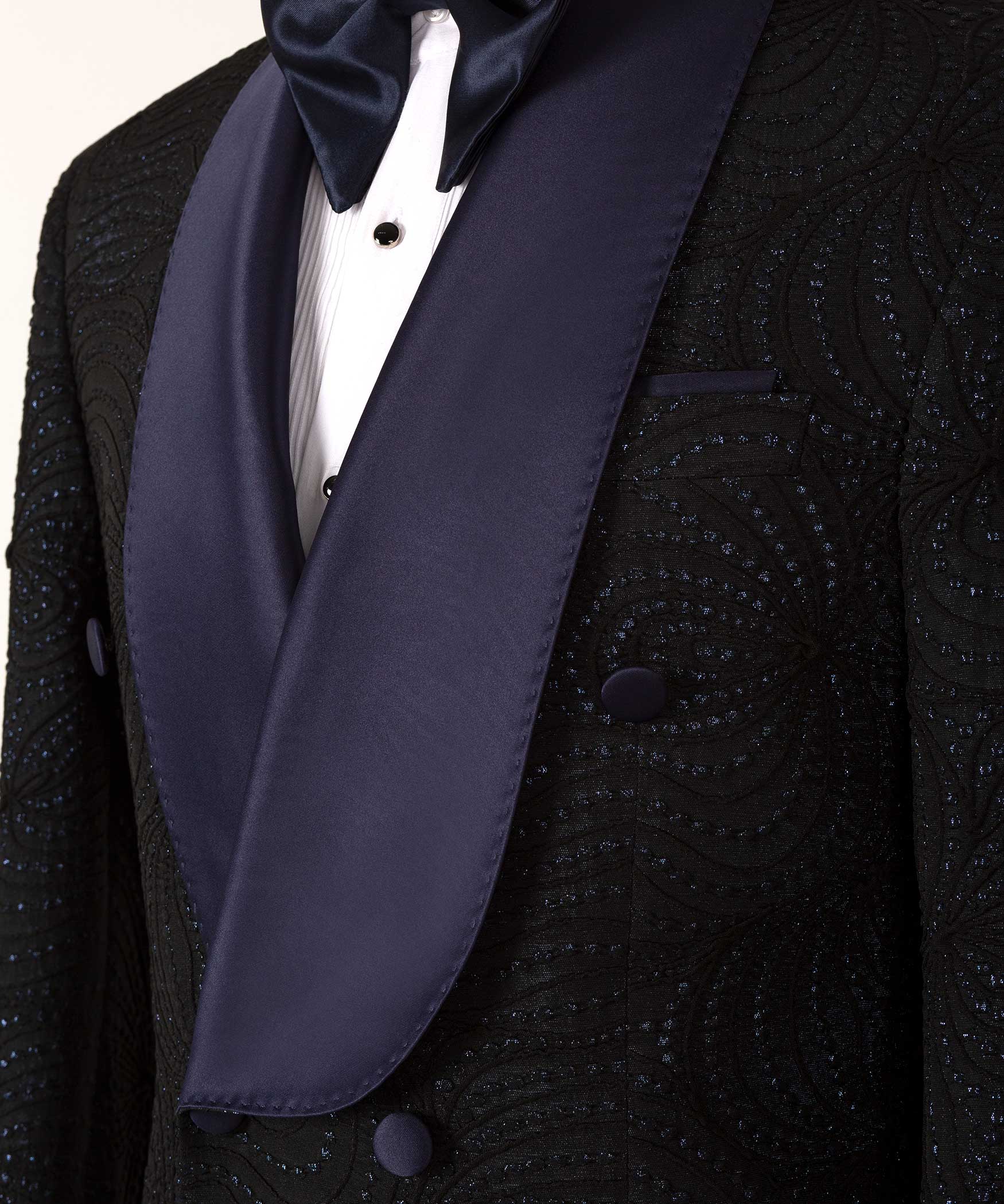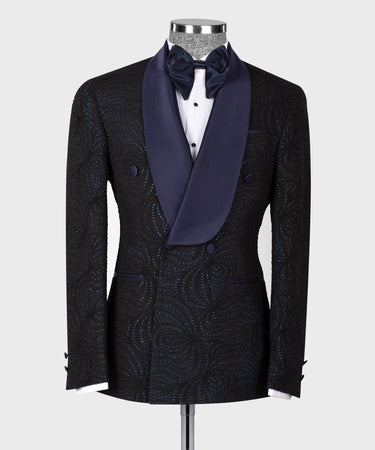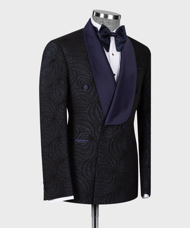 Navy Blue Glossy Patterned Black Color Double Breasted Tuxedo