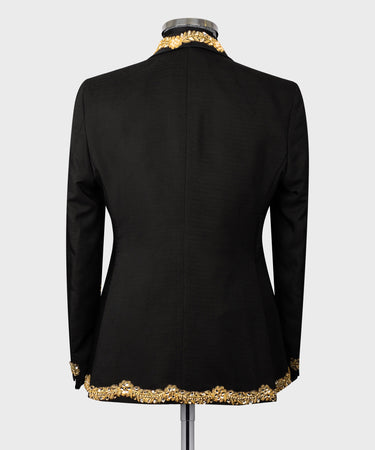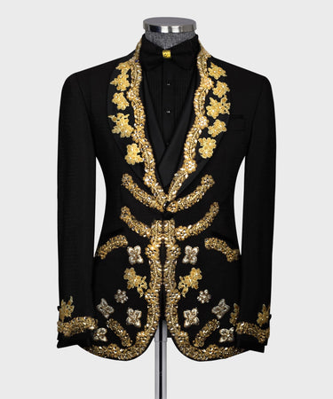 Exclusive custom tuxedos allow you to experience comfort and elegance together. Black Gold special Tuxedo from Dio Babylonian collections. Made of Silk and Wool with one button, two back Slits, Black tuxedo trousers. Can be made in any size (takes five days) by Custom Orders. Suit contain Jacket, waistcoat and Trousers.