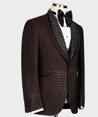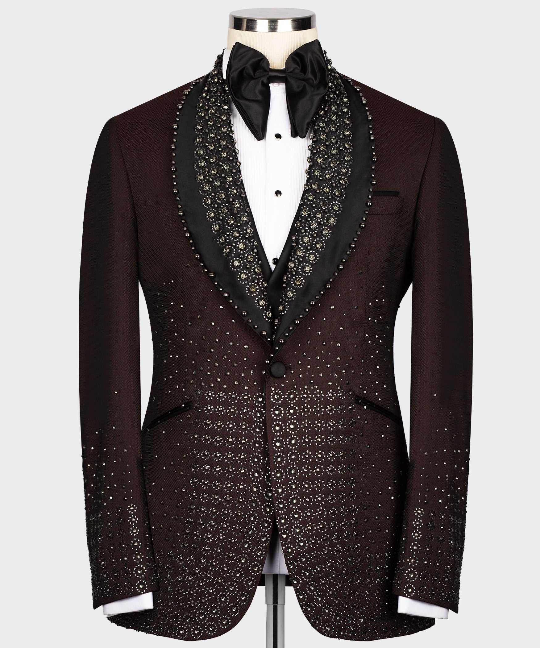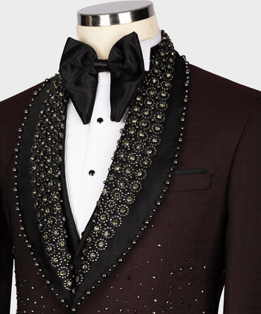 Smoking bordeaux sur mesure en satin à motifs ronds et à revers.