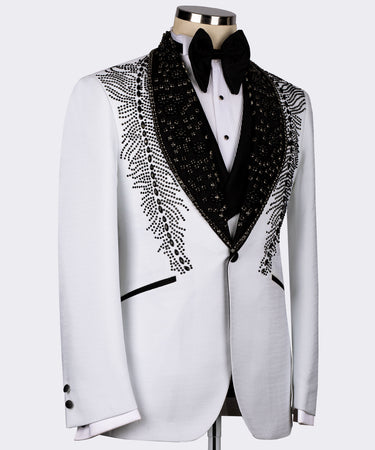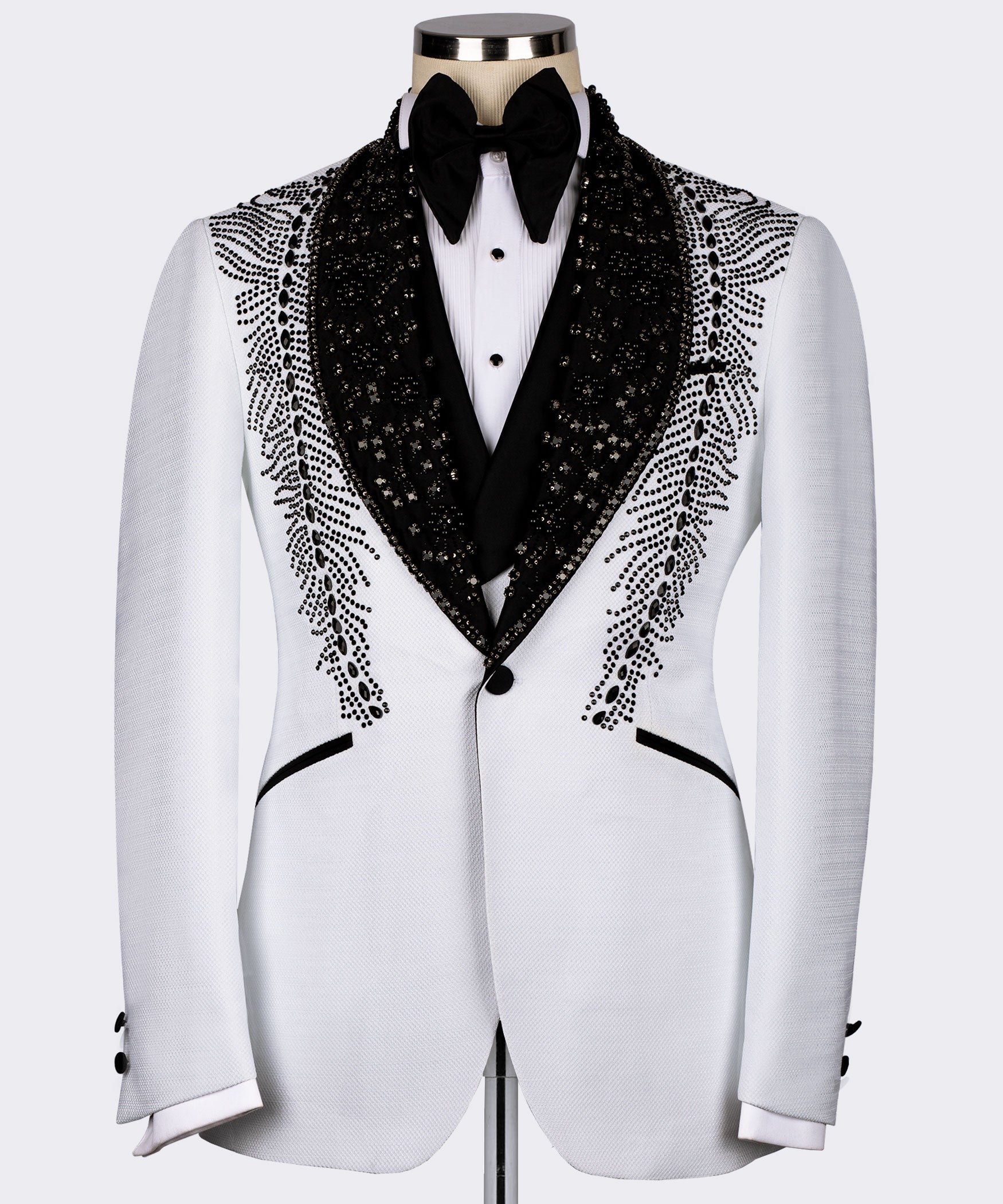 Célébrez votre grand jour avec élégance grâce à ce smoking blanc brodé de pierres et de motifs de plumes. Confectionné avec soin dans un tissu diobylonique d'une qualité exceptionnelle, ce smoking vous sera livré sous une semaine. Sa coupe sur mesure vous garantit une allure impeccable ; vous vous sentirez aussi bien que vous en aurez l'air.
