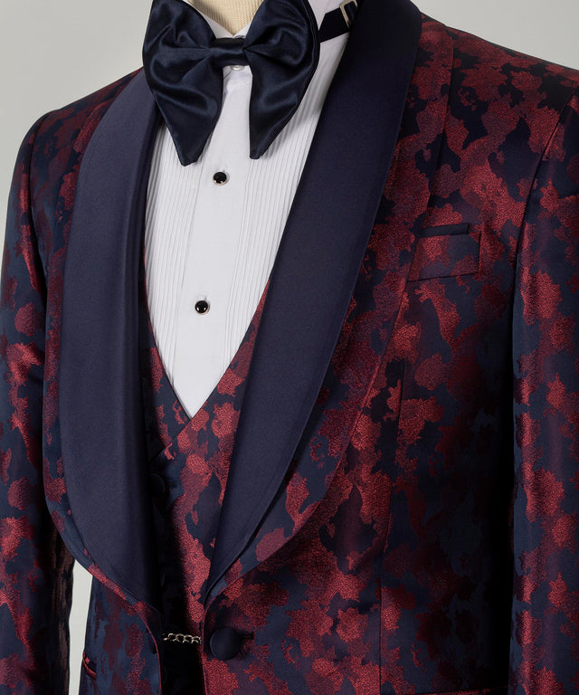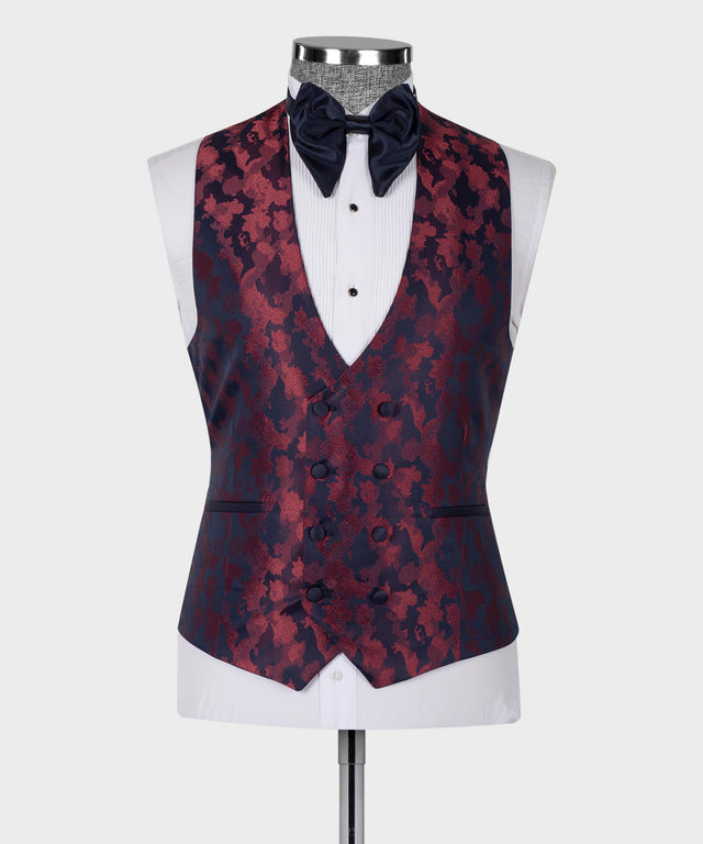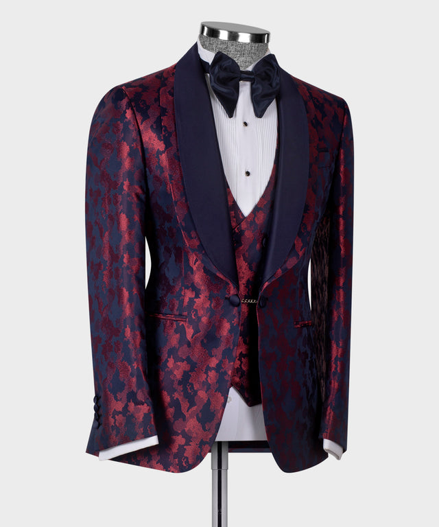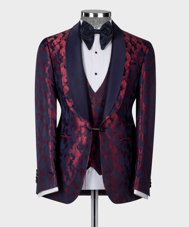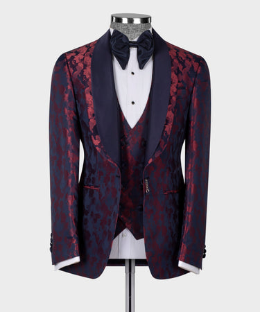 Sublimez votre tenue de soirée avec ce smoking à double revers, dont la base bleu foncé sophistiquée est rehaussée de riches accents bordeaux. Le design à double revers crée une silhouette distinctive qui ne manquera pas d'attirer les regards lors de galas, mariages et événements de prestige. Conçu pour l'homme exigeant, ce smoking allie la perfection classique à une touche de modernité, vous assurant une allure remarquable tout en conservant une élégance raffinée. Idéal pour ceux qui apprécient les associations de couleurs audacieuses et un savoir-faire irréprochable.