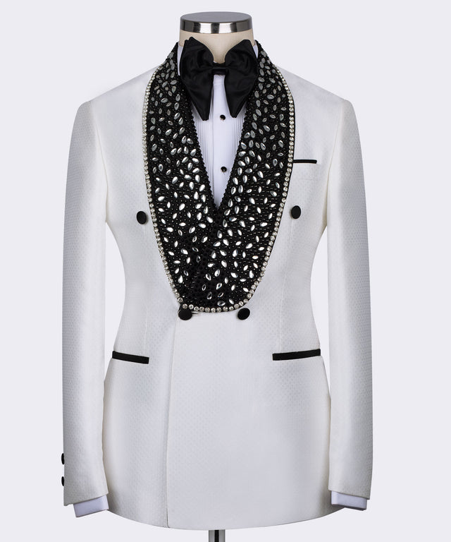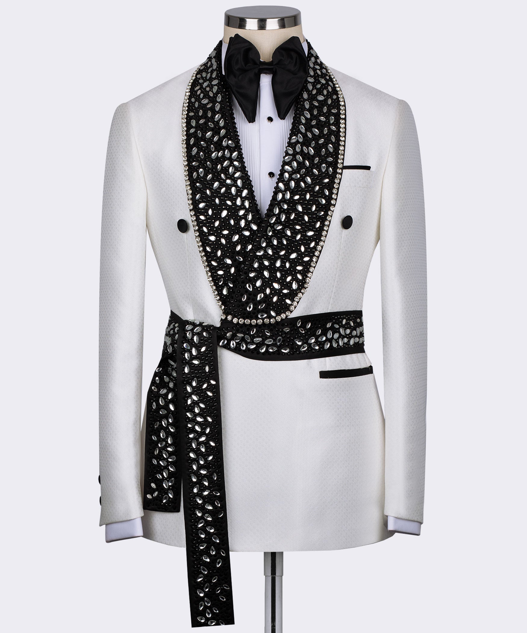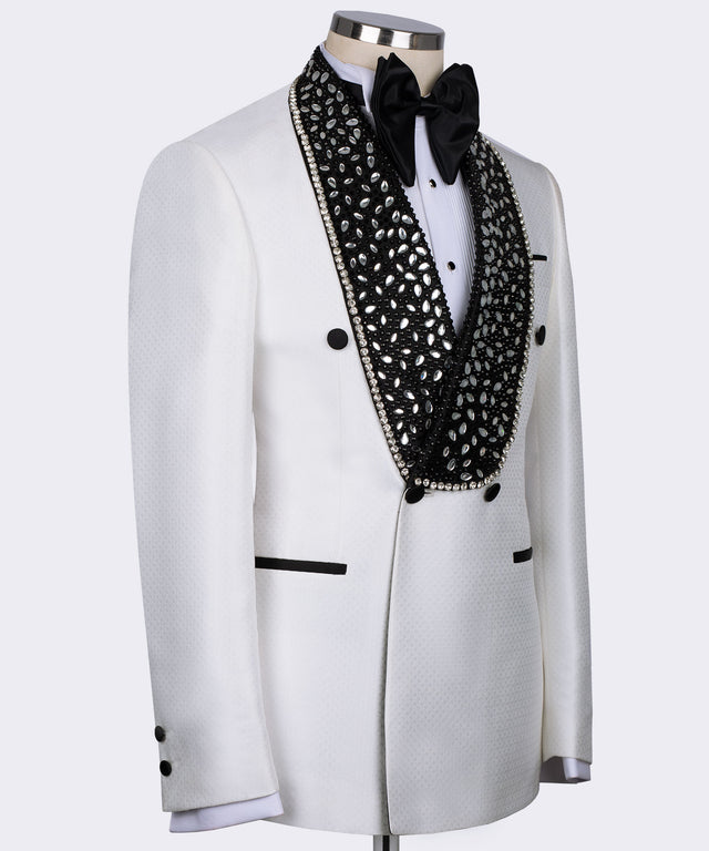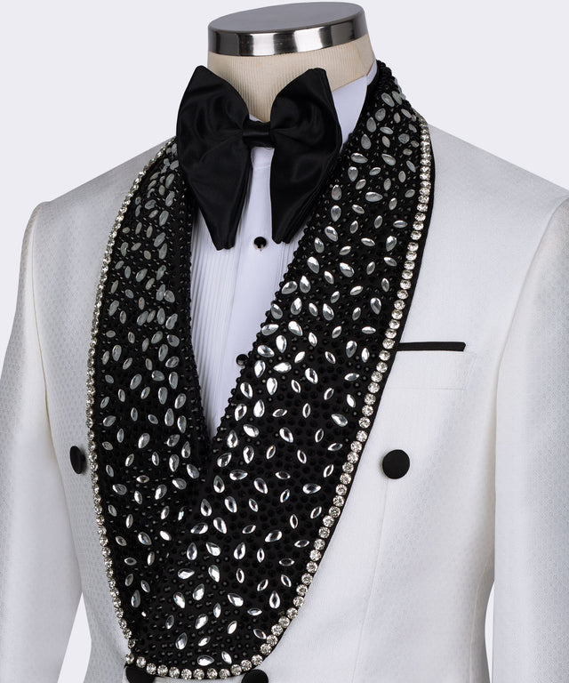 Smoking spécial à lanières blanches et pierres précieuses noires
