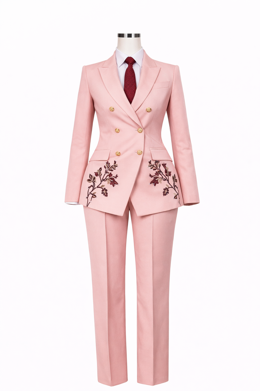 Ce luxueux tailleur rose poudré est sublimé par des broderies raffinées, ce qui en fait une pièce maîtresse. La veste croisée est ornée d'élégantes broderies florales et associée à un pantalon tailleur qui allie avec brio esthétique et structure.