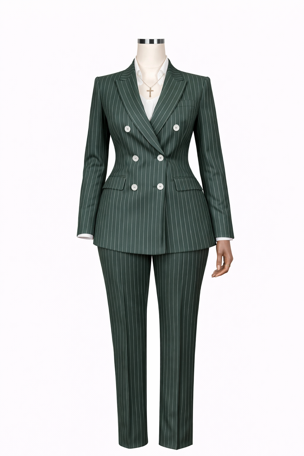 Ce tailleur vert forêt à fines rayures allie coupe classique et élégance moderne. La veste croisée souligne la taille avec élégance, tandis que le pantalon à fines rayures dessine une silhouette élancée et raffinée.