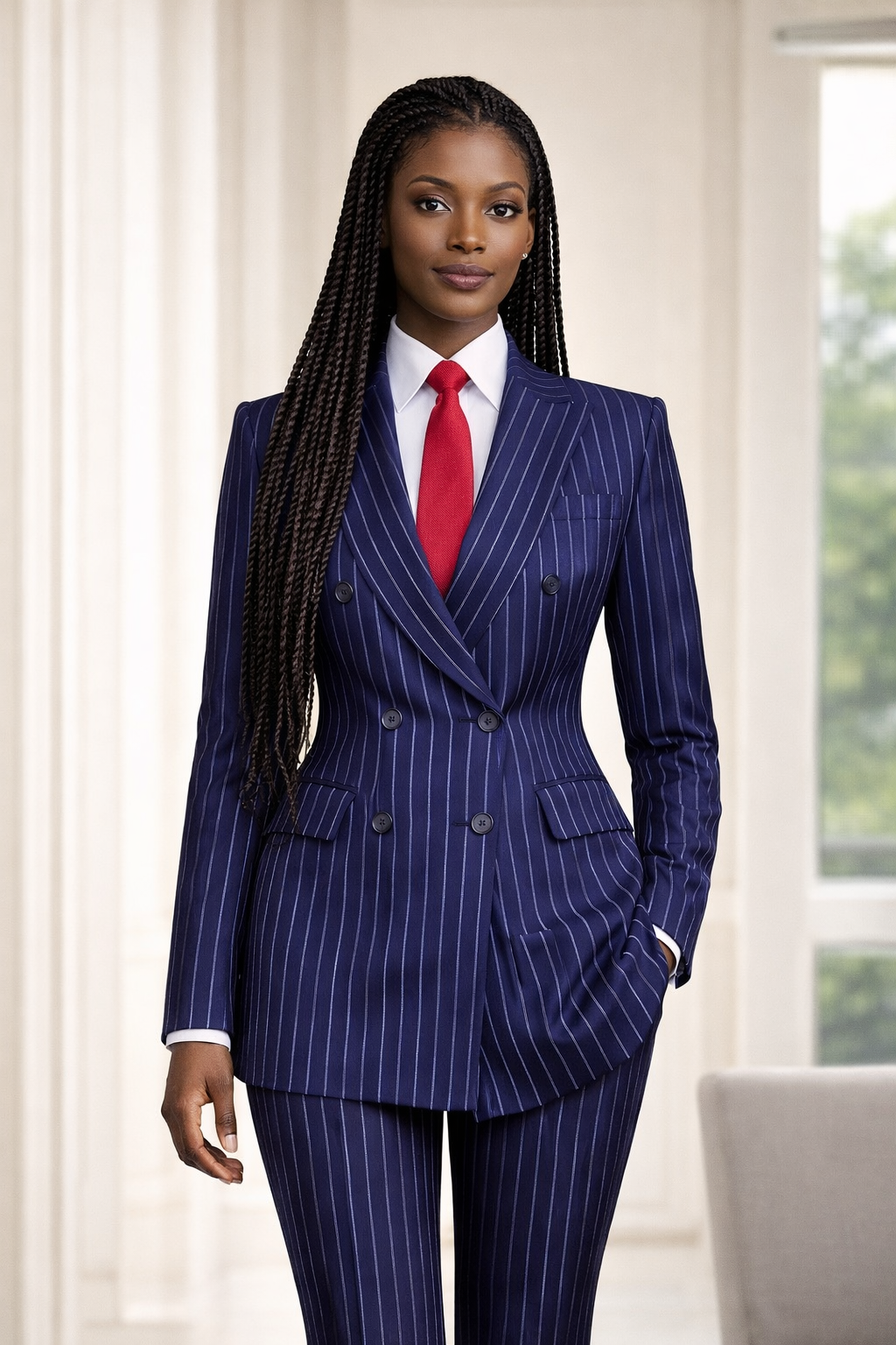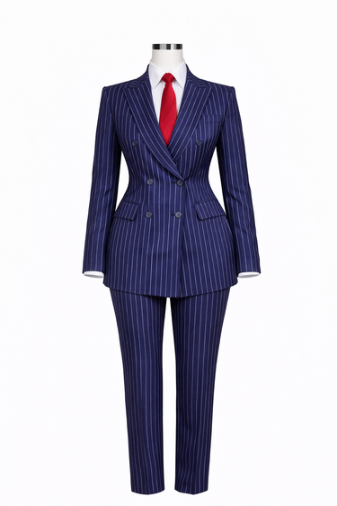 Ce tailleur classique bleu marine à fines rayures réinvente l'élégance moderne pour les femmes. Sa veste croisée impeccable et sa coupe précise lui confèrent une silhouette à la fois affirmée et féminine. Le pantalon assorti à fines rayures allonge la silhouette et complète un look de dirigeante intemporel.