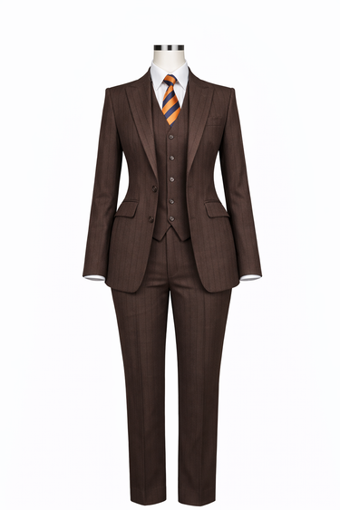 Un tailleur trois pièces intemporel composé d'un blazer cintré, d'un gilet structuré et d'un pantalon assorti. Conçu pour une silhouette élégante et affirmée, avec des détails raffinés.