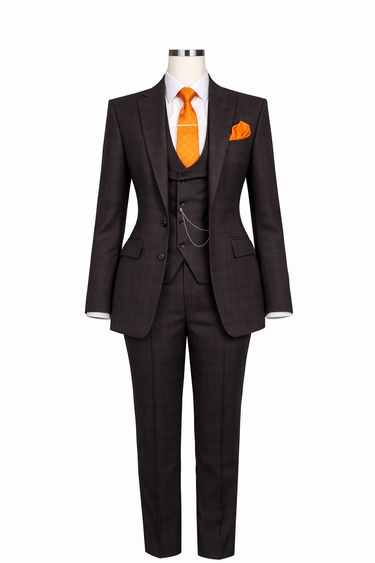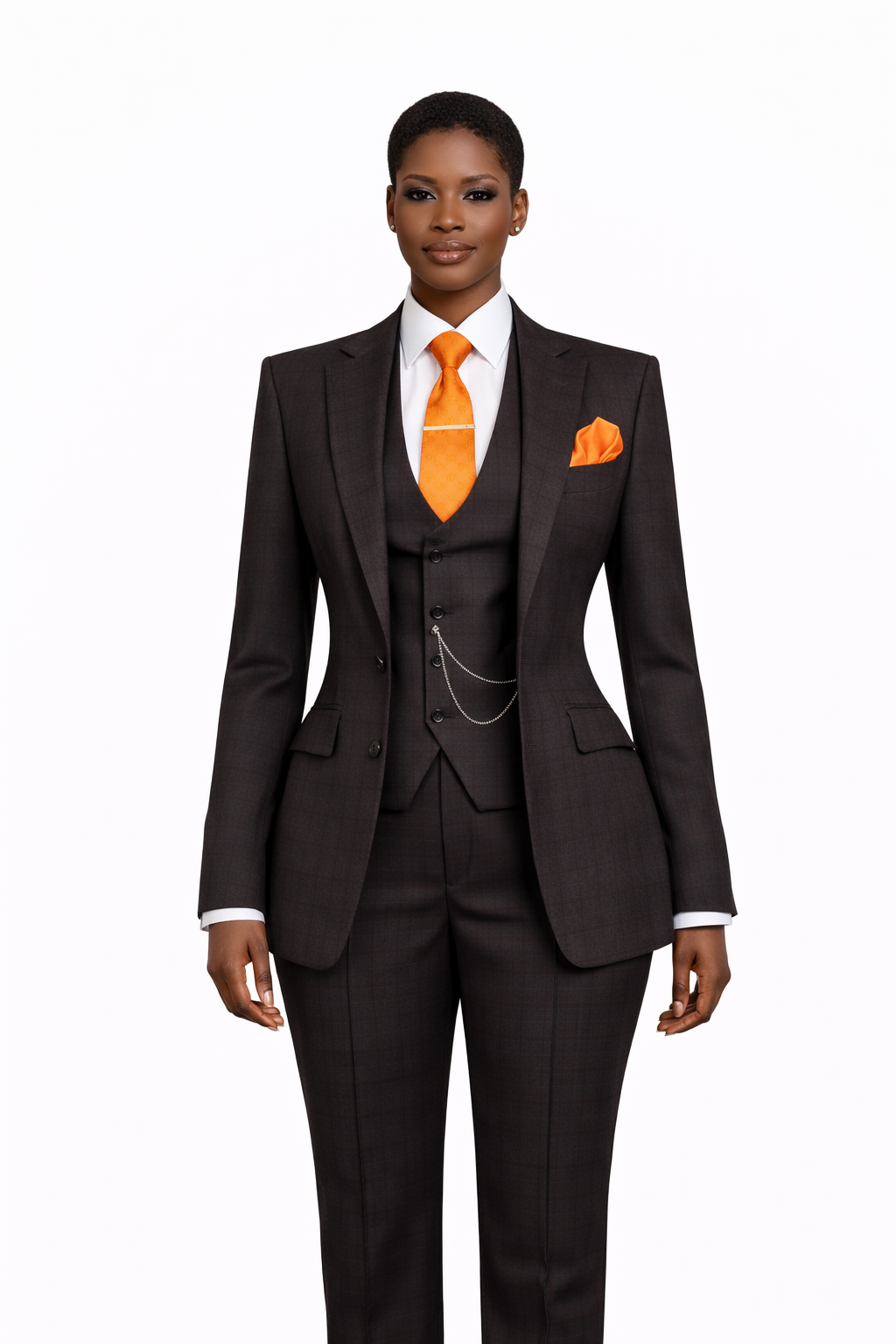 Un tailleur trois-pièces sur mesure raffiné pour femme, conçu pour l'élégance et l'autorité. Composé d'un blazer cintré, d'un gilet structuré et d'un pantalon assorti, il est confectionné avec expertise pour une silhouette impeccable.