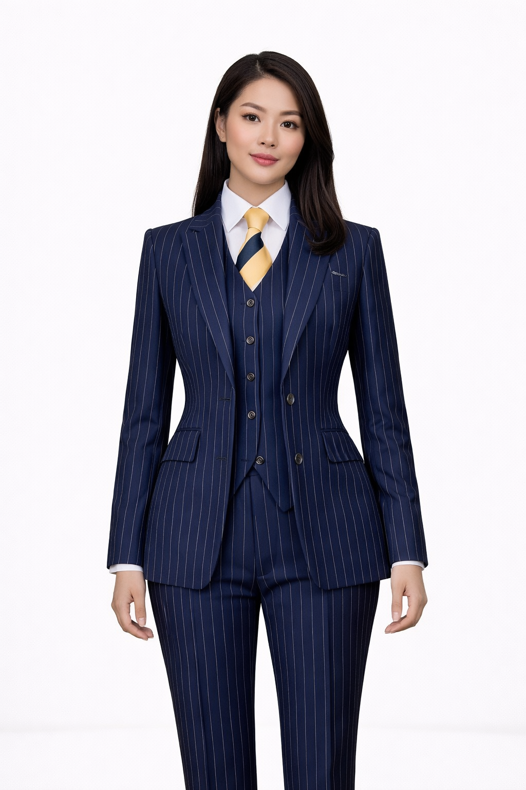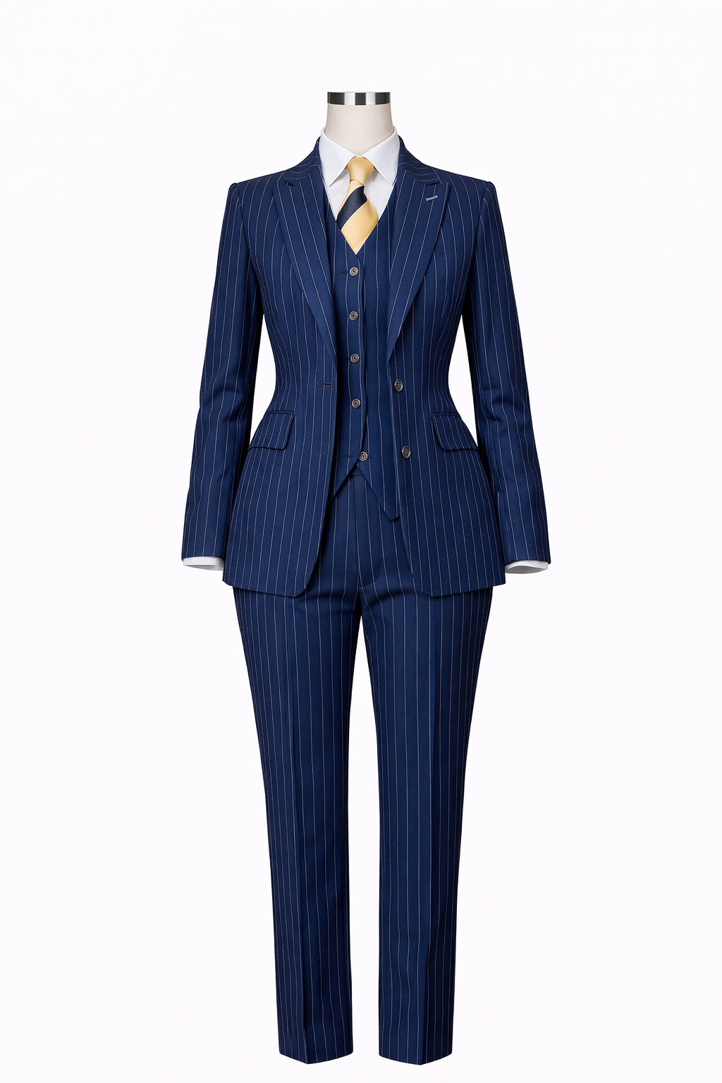 Un élégant costume bleu marine à fines rayures, composé d'une veste structurée, d'un gilet assorti et d'un pantalon. Conçu pour une silhouette affirmée et des détails raffinés, il est idéal pour les occasions professionnelles, les événements formels ou pour un style business affirmé. Disponible en ensemble complet.