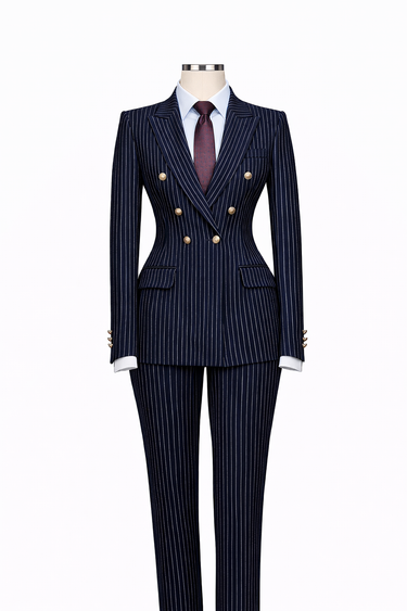 Un costume croisé à fines rayures intemporel, confectionné à la main par Vaneti Royal. Cet ensemble deux pièces sur mesure comprend une veste structurée et un pantalon assorti, taillés avec précision à vos mensurations pour une allure affirmée, élégante et pleine de confiance. Créé exclusivement pour vous.