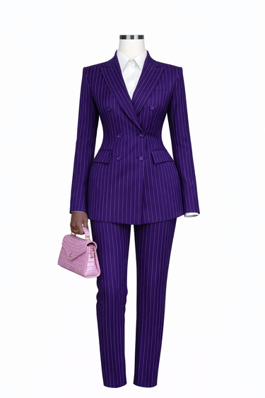 Un blazer à fines rayures raffiné, associé à un pantalon tailleur assorti, conçu pour sculpter la silhouette avec élégance et assurance. Parfait pour le travail, les occasions formelles ou pour affirmer son style.