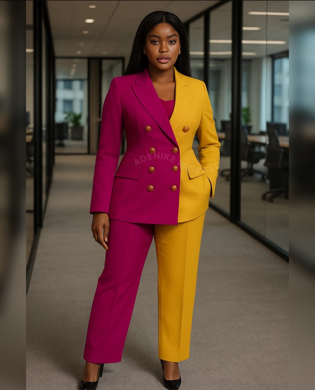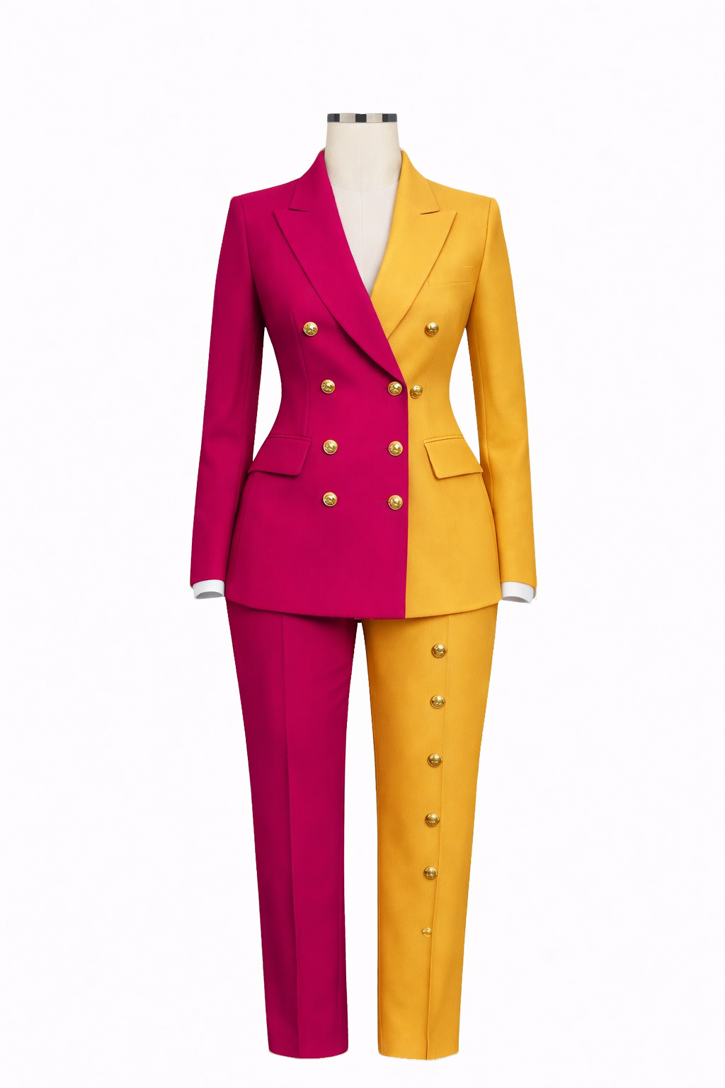 Un superbe costume croisé bicolore, confectionné artisanalement avec un savoir-faire exceptionnel par Vaneti Royal. Composé d'une veste structurée à boutons dorés et d'un pantalon parfaitement ajusté, ce modèle sur mesure est réalisé exclusivement selon vos mensurations pour une allure audacieuse, élégante et affirmée.